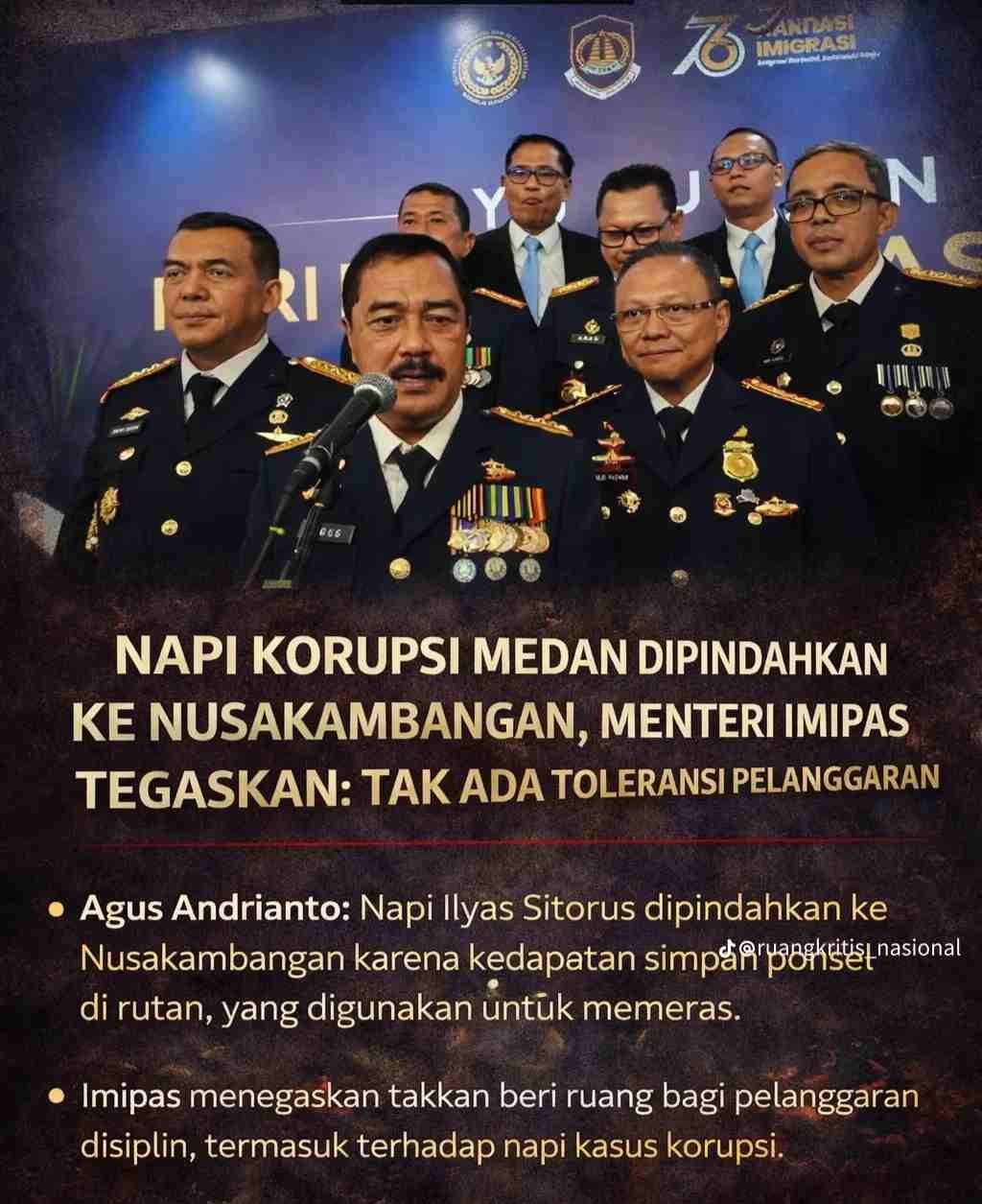 Jakarta – Aksi tegas Menteri Imigrasi dan Pemasyarakatan (Imipas), Agus Andrianto, patut diacungi jempol. Narapidana kasus korupsi asal Medan, Ilyas Sitorus, yang terbukti melakukan pemerasan dari dalam Rutan Tanjung Gusta, langsung dipindahkan ke Lapas Nusakambangan. Tak hanya itu, hak bebas bersyaratnya pun dicabut!